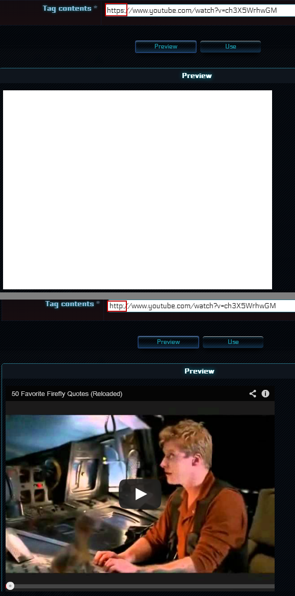 | Description | When embedding a youtube video and the user has HTTPS enabled for Google Services, only a white box is displayed vs showing the video.