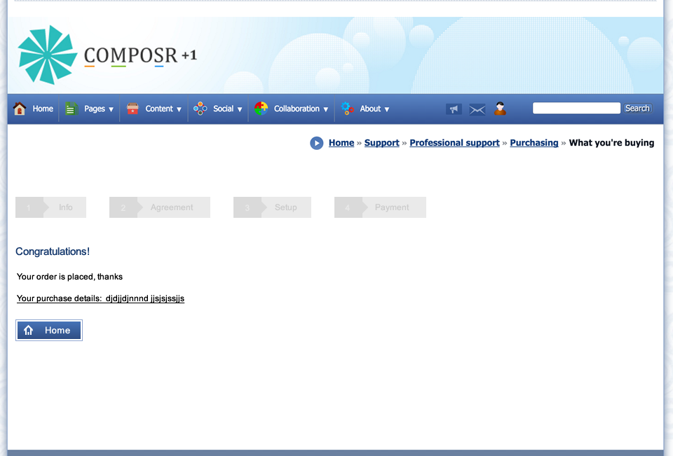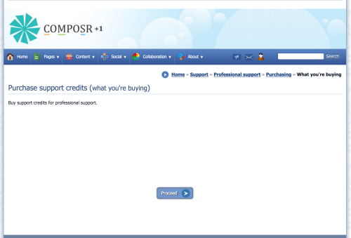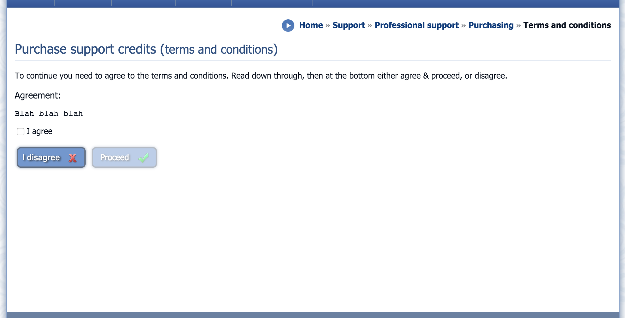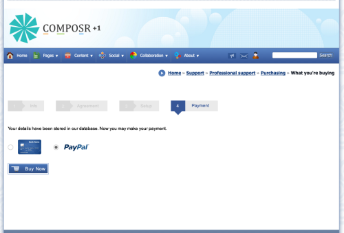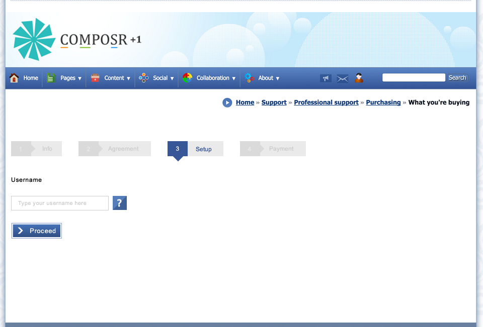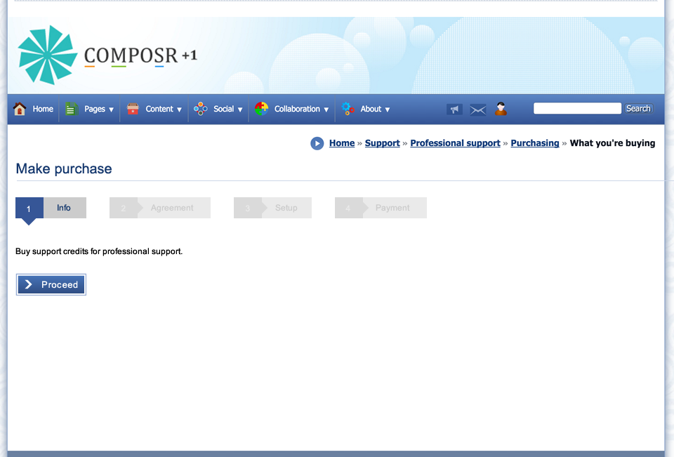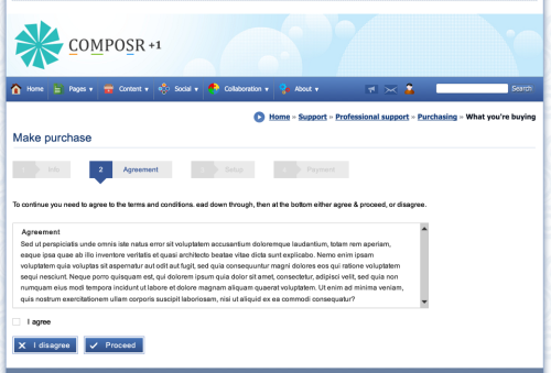 >Info>Agreement>Setup>Payment>Confirmation Adopt this design style for the purchasing module so it is much clearer. I've uploaded a/b/c/d.png which correspond to the first 4 steps above. They'd all have the same step-bar on top, but it of course highlights which of the steps is active. I suggest we redesign one of the screens, then we can apply the styling across the rest. The title of the purchasing module can just be "Make purchase", with support for overriding on a product-by-product basis. |
