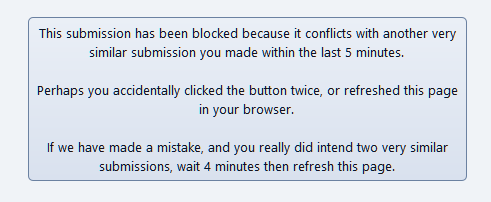 (We don't delete CSRF tokens upon posting btw, as that's super annoying, so CSRF tokens don't *automatically* prevent double submissions. It annoys me in MantisBT [here], you can't use the back button properly. We do expire them though.).