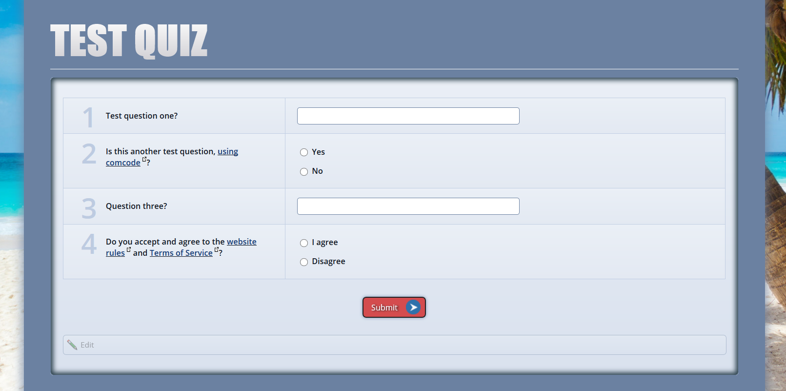 Description When creating or editing a quiz, the "Questions" field supports Comcode.