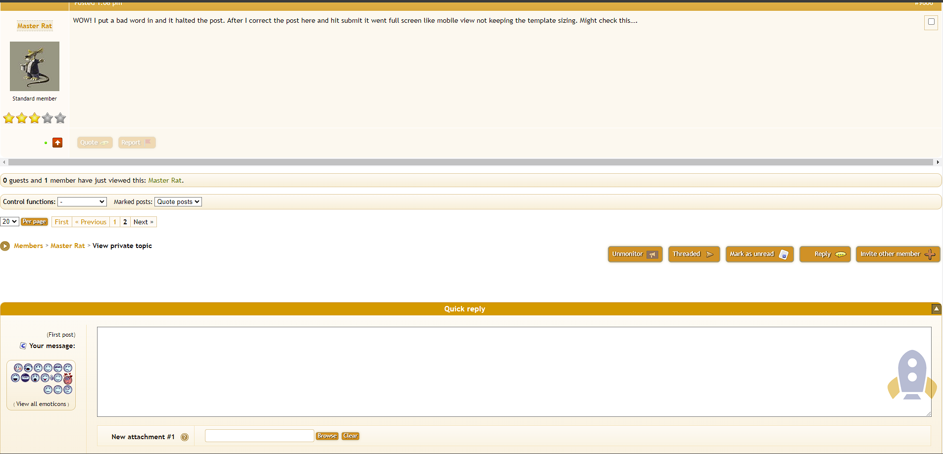 Description I wrote a PM to someone. I included a word that is on the bad word list and it caught it, I then deleted the word and hit ok then send after. I sent the PM the screen went into what I would refer to as mobile (Fullscreen) mode and I had to reload from home to get the template back to normal size.