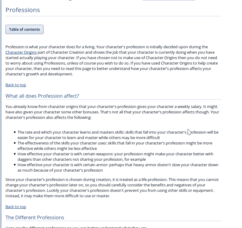Since your character's profession is chosen during creation, it is treated as a life profession. This means that you cannot change your character's profession later on, so you should carefully consider the benefits and negatives of your character's profession. Luckily your character's profession doesn't prevent you from using other skills or equipment. Instead, it may make them more difficult to use or master.<br />