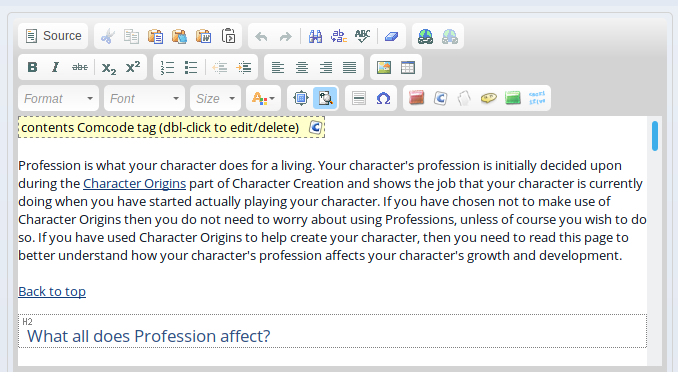 Profession is what your character does for a living. Your character's profession is initially decided upon during the <a class="user_link" href="http://www.legendsofnorova.net/ocportal/index.php?page=wiki&type=browse&id=12&keep_wiki_root=20">Character Origins</a> part of Character Creation and shows the job that your character is currently doing when you have started actually playing your character. If you have chosen not to make use of Character Origins then you do not need to worry about using Professions, unless of course you wish to do so. If you have used Character Origins to help create your character, then you need to read this page to better understand how your character's profession affects your character's growth and development.<br />