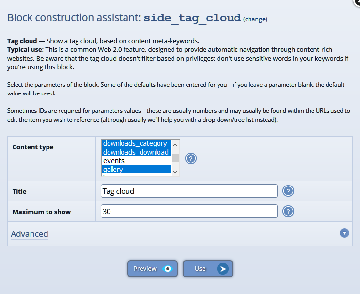 block params can equal "catalogue_category,catalogue_entry,comcode_page,downloads_category,downloads_download,events,gallery,image,news,quiz,video,wiki_page" title="Tag cloud test" zone="_SEARCH"