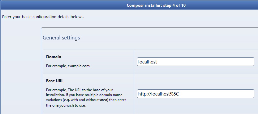 When you reach Step 4 of the installer, amend the Base URL by removing any erroneous %5C's before proceeding.Existing installations:-