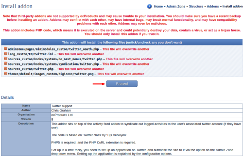 The next page is to confirm our actions. It will display a list of files which will be installed on the system during Twitter addon integration. We can untick/uncheck any file if we are not sure about them. The page will also display the details of the addon like Name, Author, Organisation, Version, Description etc on the bottom of the page as a table. We need to press the “Proceed” button to start the Twitter addon installation.