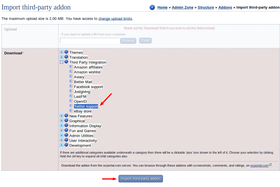 Then select “Twitter Support” from the “Third Party Integration” category, and press “Import third-party addon” button.