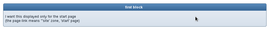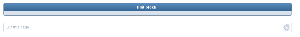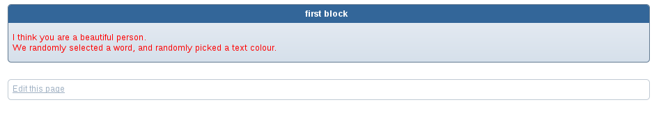 This line adds the block to our front page, the box defines the outer section of the block and string parameter passed to it(“first block”) will be placed in the title bar of our div box.