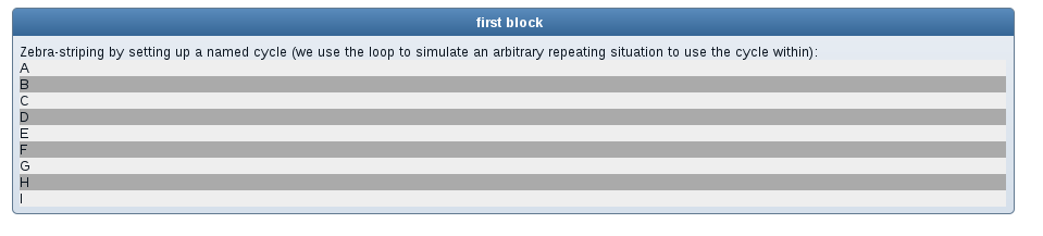 Zebra-striping by setting up a named cycle (we use the loop to simulate an arbitrary repeating situation to use the cycle within):