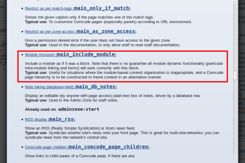 You can select “main_include_module” to add a module to the current page. It is the “Module inclusion” block in Composr.
