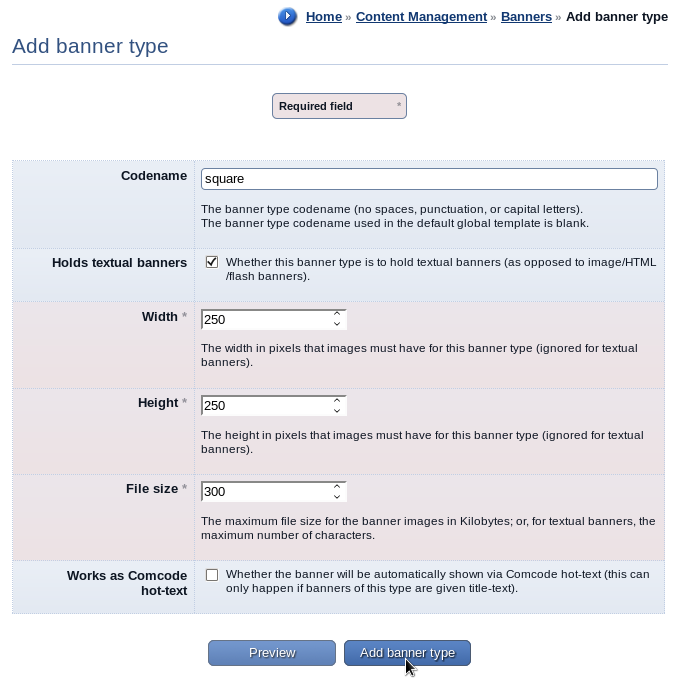 1. Log in to “Adminzone” and select “Banners” in the “Content” section dropdown list. In the “Banners” page you should see the option “Add banner type” select that, this will take you to banner type form.