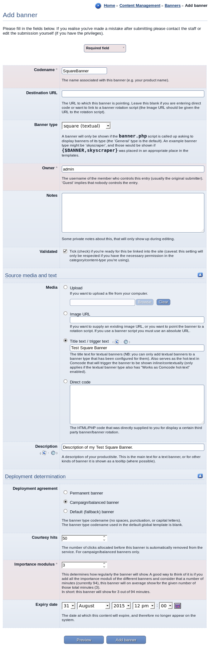 Banners are very useful in terms of advertising, or highlighting something important like an upcoming event maybe. Composr has built-in support for Banners and supports different Types of Banners.