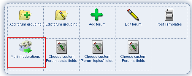 To add a multi-moderation, navigate to Admin Zone, Structure->Forums->Add Multi Moderation