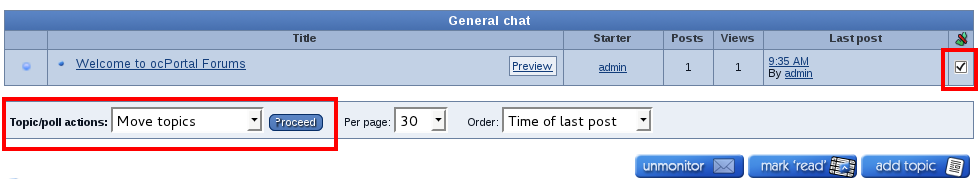 You can try it yourself by going to the Forums page, select a random forum and add a sample topic and posts to test, now you should find the newly created topics list in the Forum view page. In the same page, you should see a checkbox to the top right of every topic which will let you mark the topics and perform a mass moderation as shown in the image.