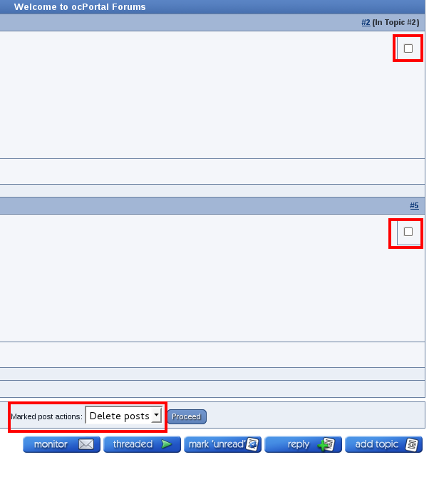 To use a multi-moderation, you need to browse to an appropriate topic. Select an appropriate multi-moderation from the 'Topic actions' drop-down list, and click the 'Proceed' button to apply the multi-moderation to the topic.