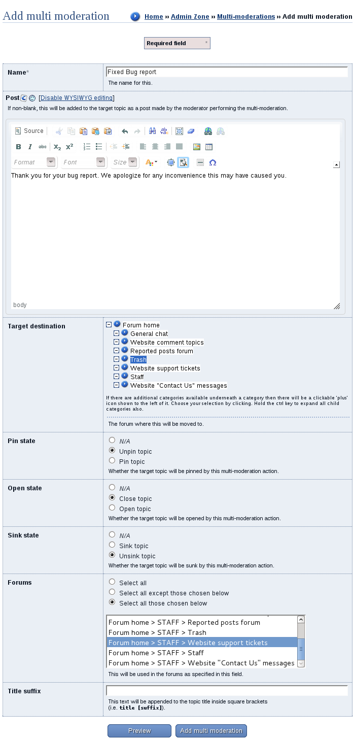 Fill out all the fields on the form as required. Try to make the post sound as professional as possible (if the multi-moderation is for making a formal response). Submit the form, and the multi-moderation will be available for use in all the specified forums (from the drop down list of topic actions that you see when viewing a topic).